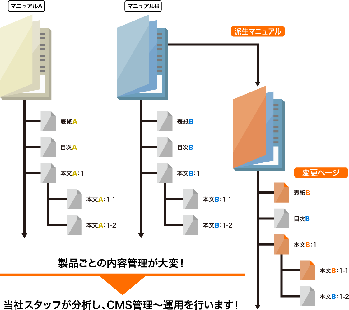 マニュアルCMS活用を効果的に行うためにも、重要なCMS構築~管理運用。弊社専任スタッフが、各冊子内容の関連性、ベース冊子と派生冊子の差異の管理などを分析し、CMS管理・運用のご提案を行います。
